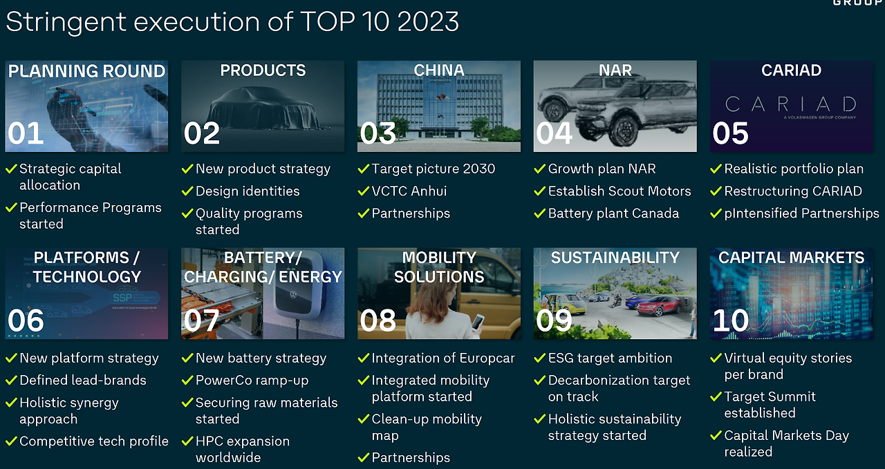 The Volkswagen Group, which owns multiple car brands such as Porsche, Audi, and Volkswagen, mentions that Cariad, its software company, is continuing its efforts to establish itself as a core entity and has undergone restructuring. You can access the materials at https://www.volkswagen-group.com/en/publications/presentations/volkswagen-group-presentation-analyst-and-investor-conference-2024-2678.