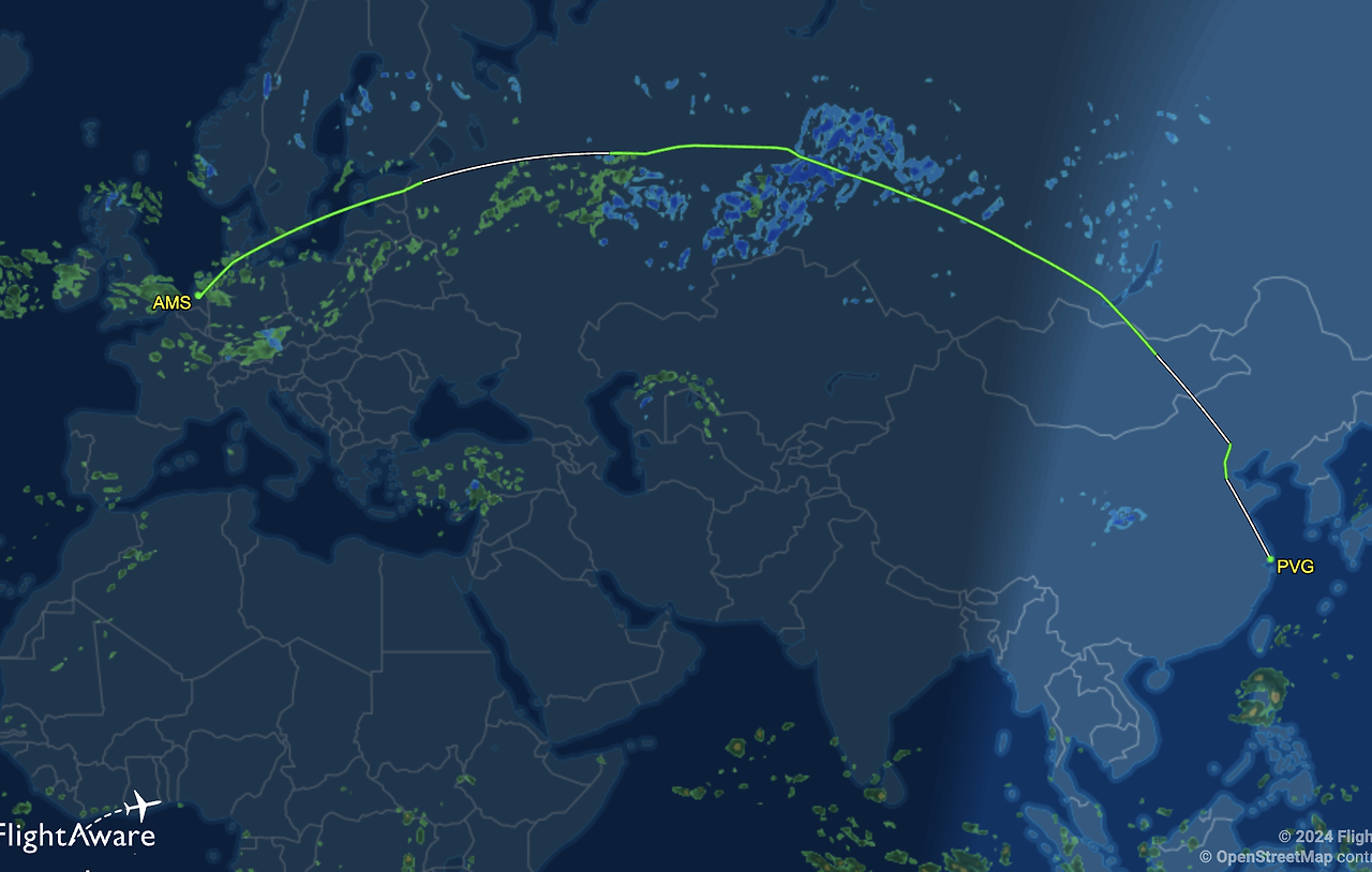 The flight from Amsterdam to Shanghai takes approximately 10 hours and 45 minutes. You can check the route at https://www.flightaware.com/live/flight/CES772/history/20241117/1910Z/EHAM/ZSPD.