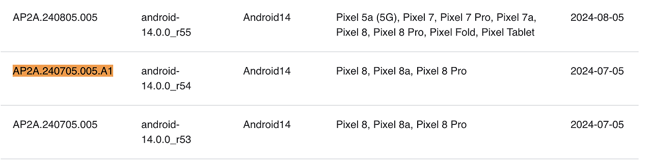 AP2A.240705.005.A1 is the actual ID, and by checking this link, you can find that it corresponds to version android-14.0.0_r54, which was released on July 5, 2024.