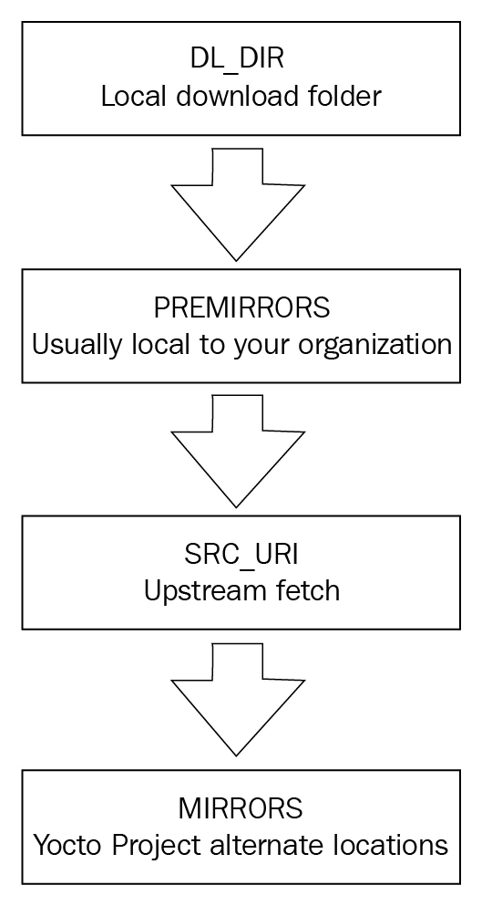 In this way, Yocto optimizes network usage and attempts to download files through various paths to increase the availability of source files. SRC_URI defines the original location of the source and is used as a last resort when mirrors and caches fail.